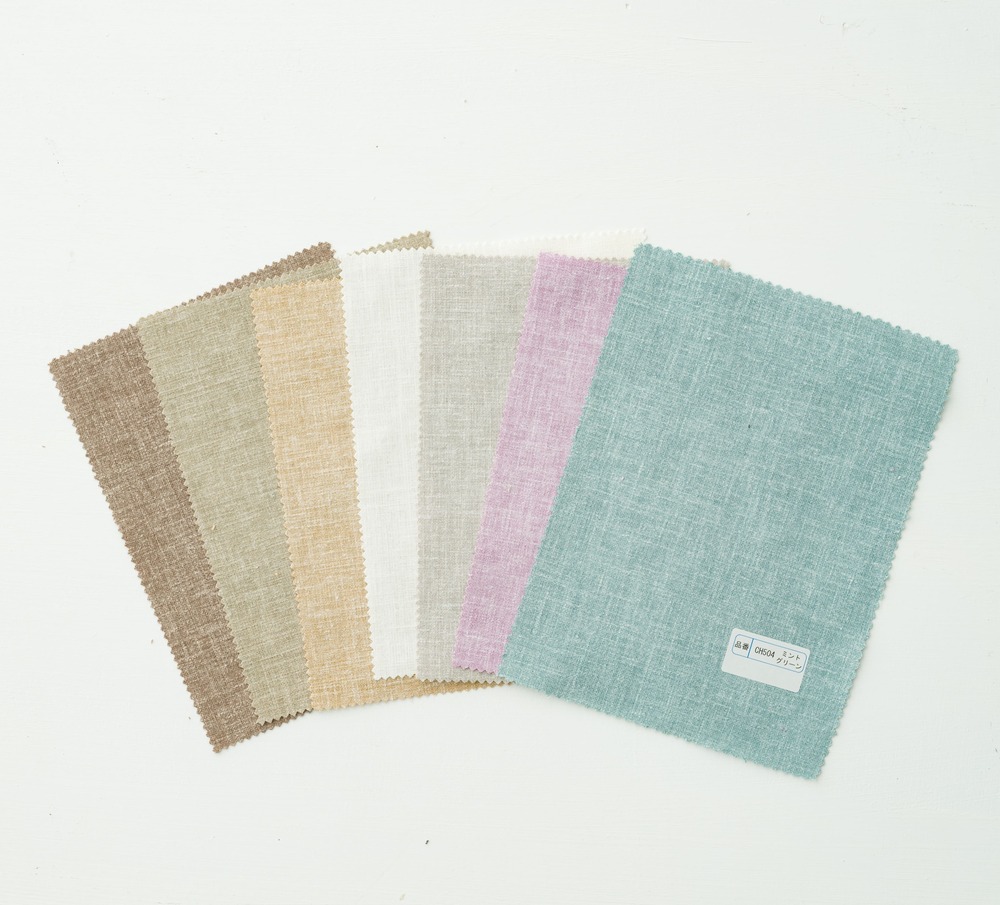 写真の「ルコット」のクリームは、リネンライク生地の特徴がより活かされたカラー。素朴な風合いですが、チープに見えることもなく、柄物と組み合わせるのもおすすめです。