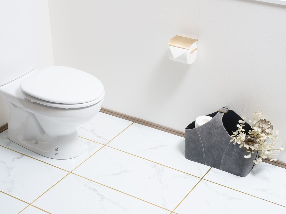 華やかなゴールドの目地棒と大理石風のフロアタイルで、おうちのトイレがまるでホテルのような雰囲気に。