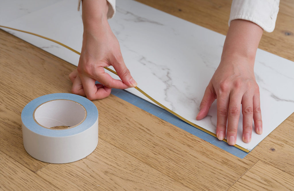 ユカオを目地棒の幅と長さにカットし、目地棒の裏面に貼り付け剥離紙を剥がし、フロアタイルに沿って貼り付けます。