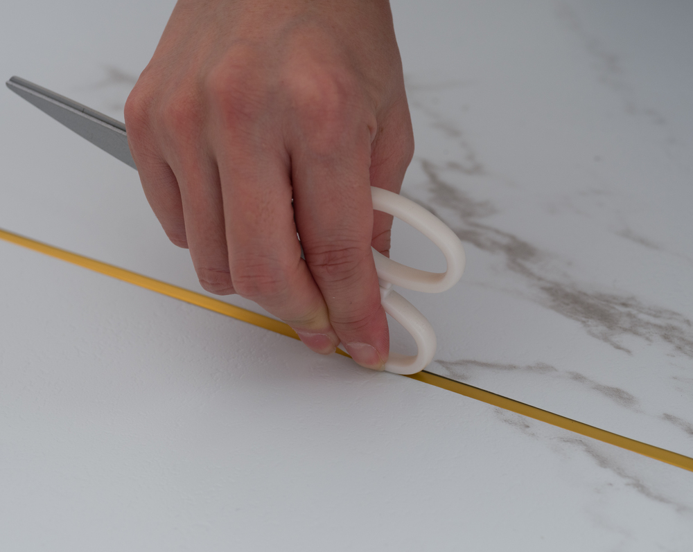 目地棒を貼った後は、幅に合うもので目地棒を圧着するのがポイント。ちょっと面倒かもしれませんが、お手持ちの文房具や工具などで幅に合うアイテムを探してみてください(写真ではハサミの持ち手を使っています)。
