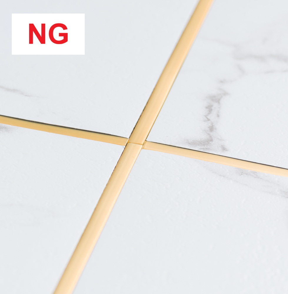 フロアタイル同士の角と、目地棒の端が付き合わないように貼っていきましょう。剥がれの原因になってしまいます。片方のみの端ぞろえは問題ありません。