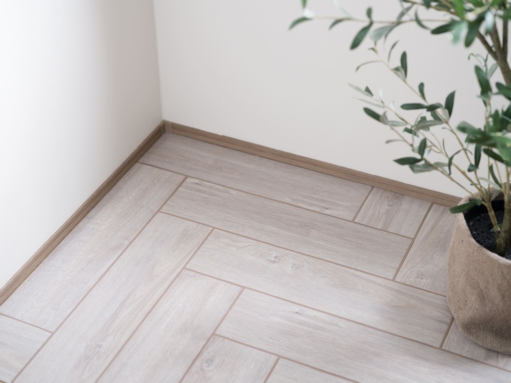ナチュラルインテリアに合わせるなら、木目調のフロアタイルとモカブラウンの目地棒がおすすめ。ちょっと手間がかかりますが、ヘリンボーン貼りにすることで、さらに“こだわり感”もアップしますよ。