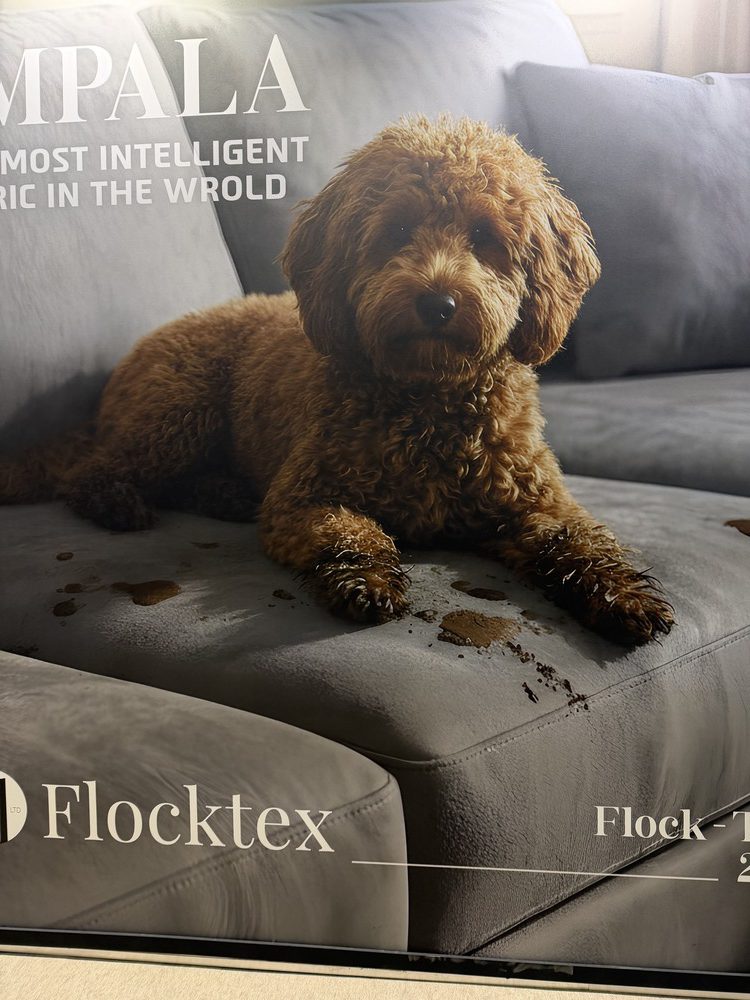 ペットの嘔吐物や泥汚れなどを簡単に落とすことができる素材や、猫や犬の爪が引っかかりにくい、あるいは引っかいても糸が飛び出しにくい特殊な織り構造の生地も展示されていました。