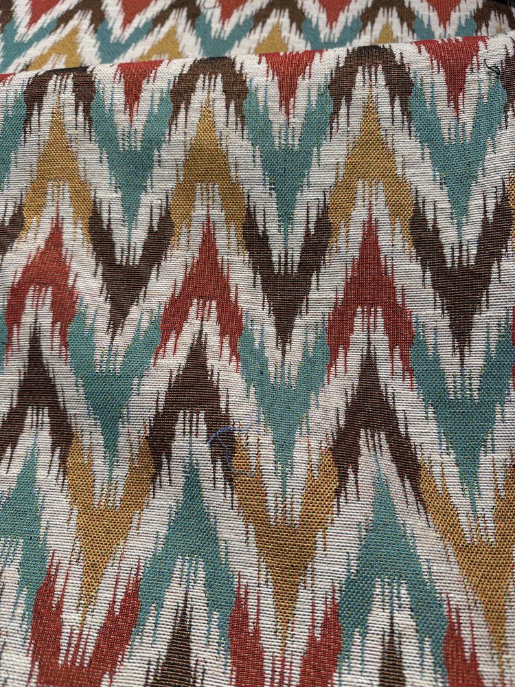 そして、写真②のような伝統的な「イカット柄(絣織り)」の「かすれ」を再現したデザイン。デジタルの正確な織りではなく、民族的なデザインであえて曖昧さを表現することで温かみのあるデザインになっていました。