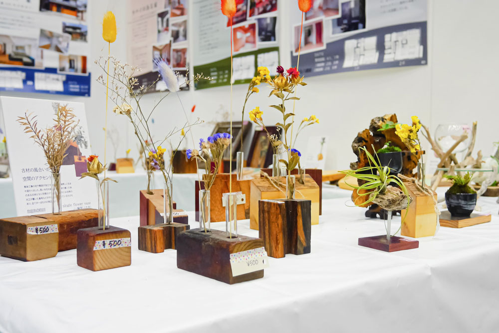 「北八建設」は、勝山市の建設会社。地域の課題やニーズに寄り添う様々な事業を行っており、今回は解体材や端材をアップサイクルした一輪挿し等を販売予定です。