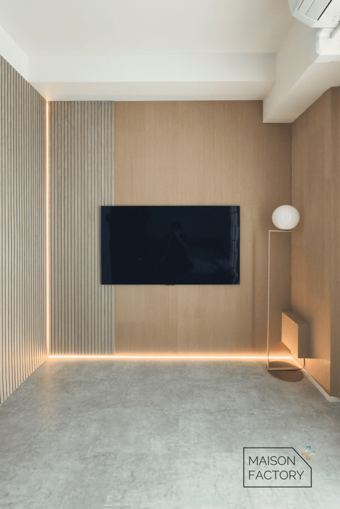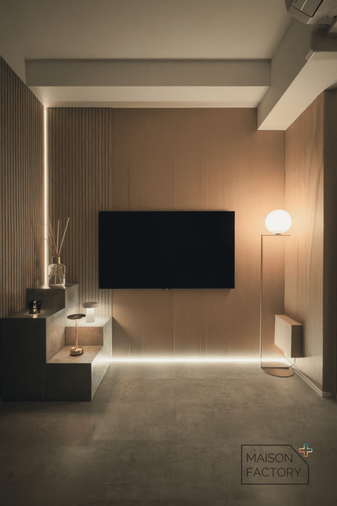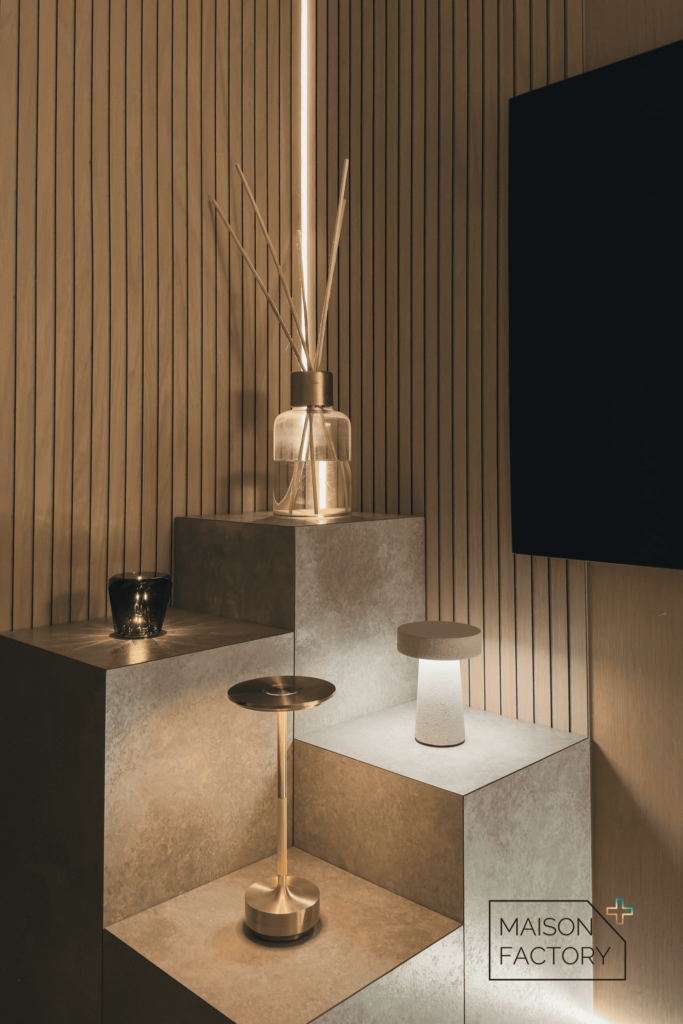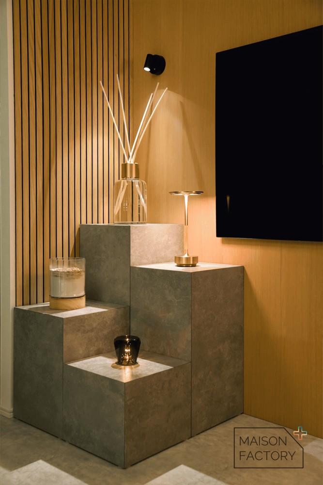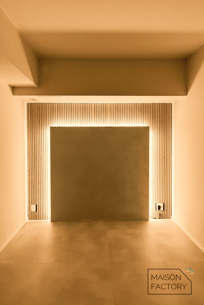 上の写真は、コーナー部分に新色RIB:BOを使用し、角にはライン型の照明も。正面テレビ側の壁はフェイクの壁を設置していて、RIB:BOをそのままボンドで貼りつけたそうです。暗くすると雰囲気も変わってラグジュアリーな空間に。