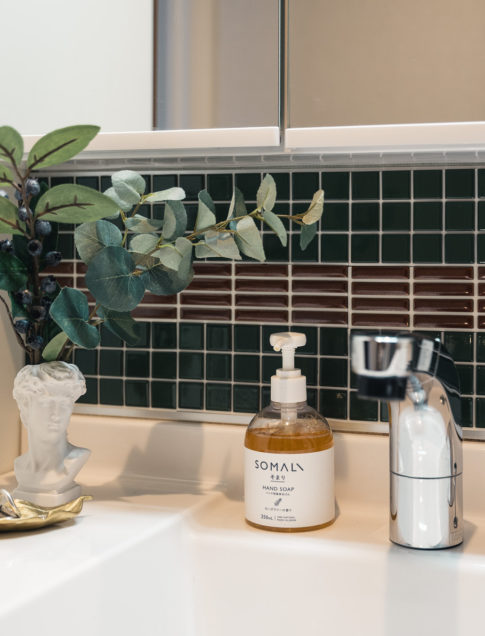 上の写真は、スタッフCumin宅の洗面台。ピンク系のメインカラーにグリーン系のアクセントという、海外の子ども部屋のような個性的な組み合わせで遊び心のある洗面台に。