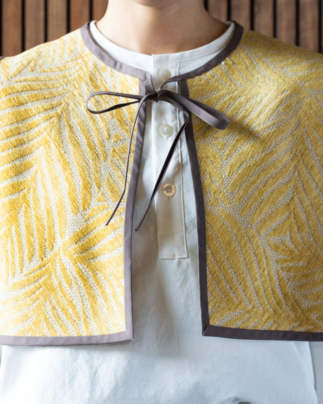 あっという間にサイドオープンベストが完成しました。リーフ柄のモダンな印象と温かみのある色合いが特徴のカーテン生地でつくってみたので、優しげな雰囲気にしてくれるファッションアイテムになりました。シャツやカットソーの上からサラッと重ねるだけで、いつもの装いが新鮮に感じられます。