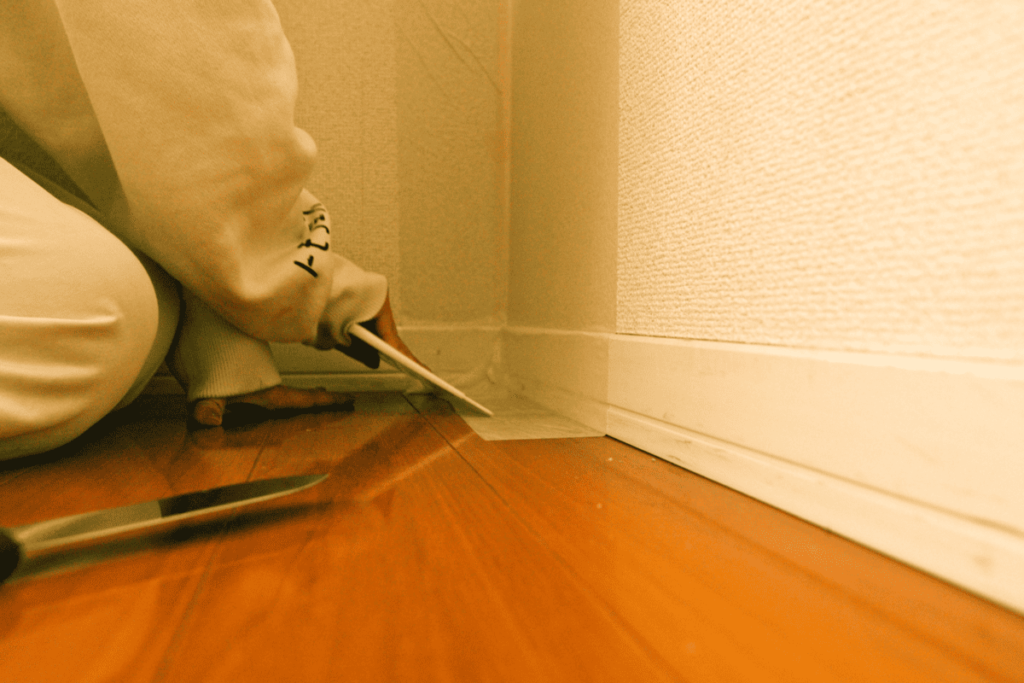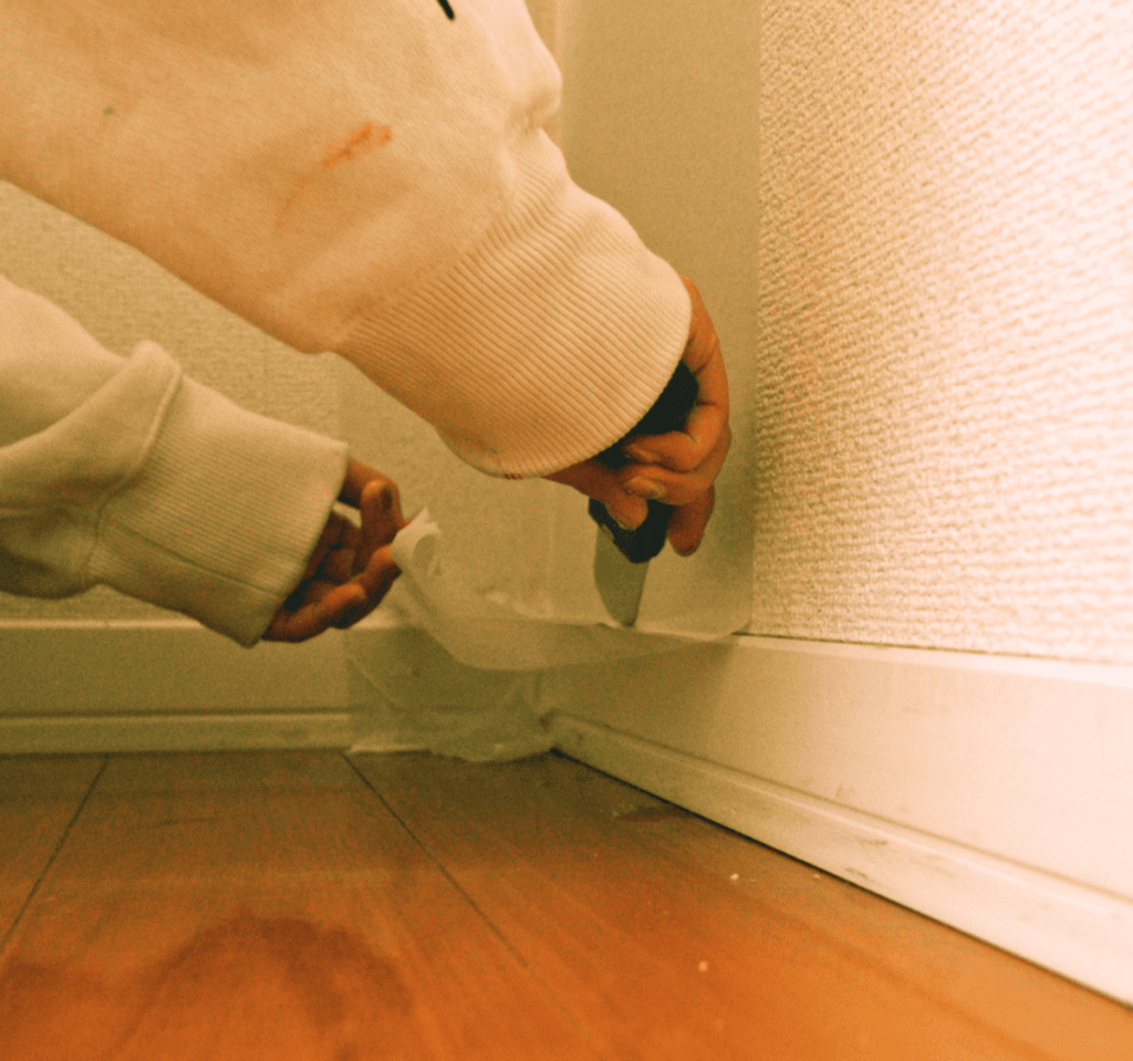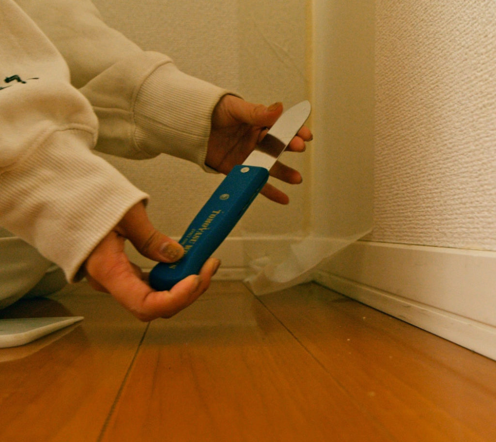 巾木よりも少し長めにカッターでカット。その後、角ベラで壁と巾木のつなぎ目を優しく密着させます。上下に余らせたテープは天井と床に貼っておきます。