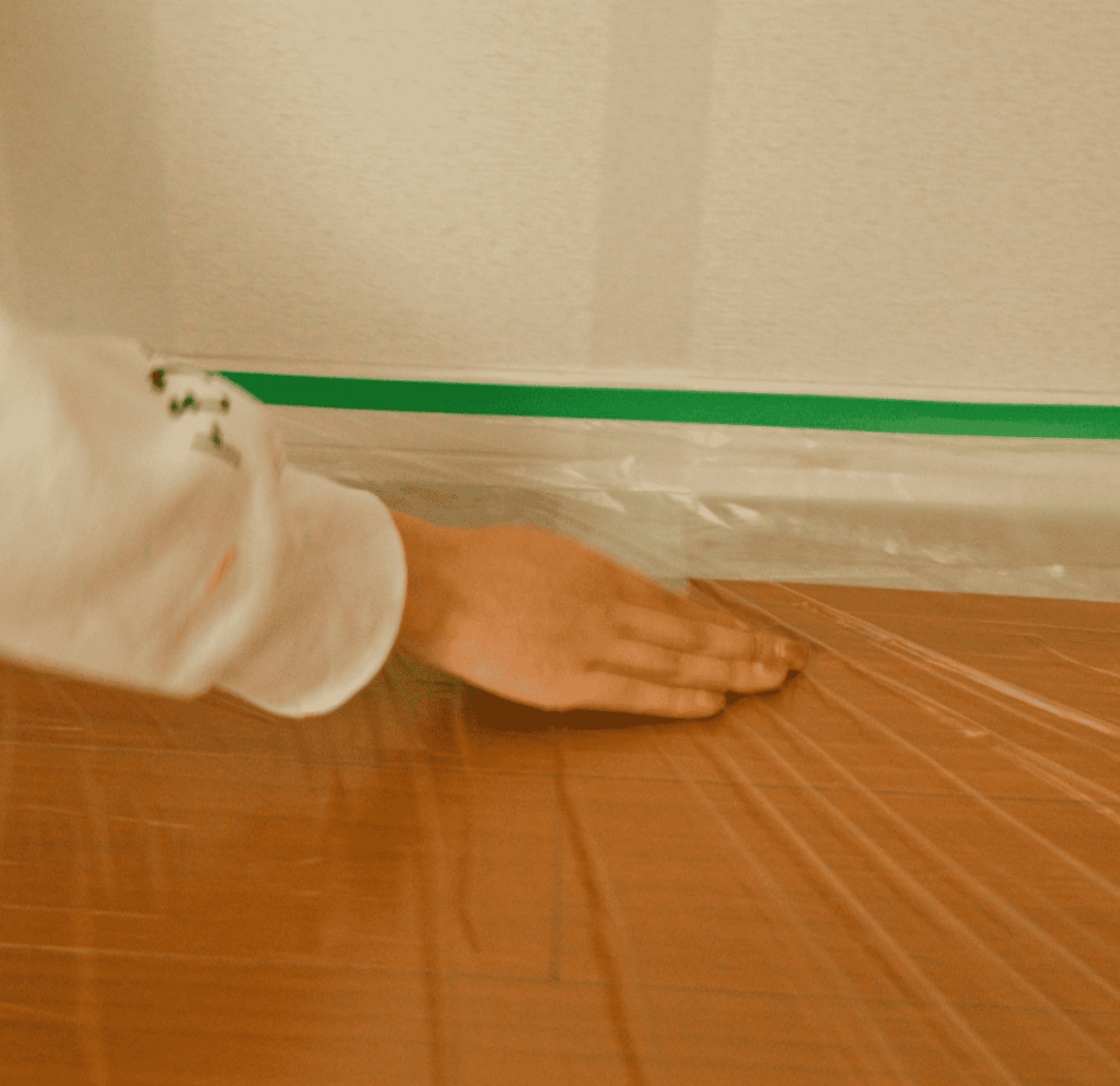 テープとポリシートが組み合わさったマスカーテープを用意します。巾木にテープを合わせ、塗料が床に付かないよう、広範囲にポリシートを広げます。両端には余った新聞紙などで広げておくと、さらに安心です。