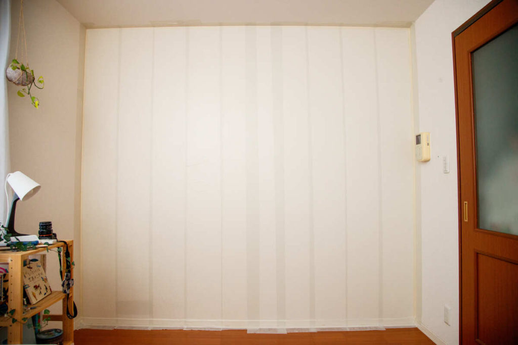 Cyanのおうちの壁一面では、10枚分をカットしました。3人がかりで貼り付け作業を行うと、かかった時間は1時間ほど。塗料が一切壁に漏れることがないよう、頑丈な土台ができました。