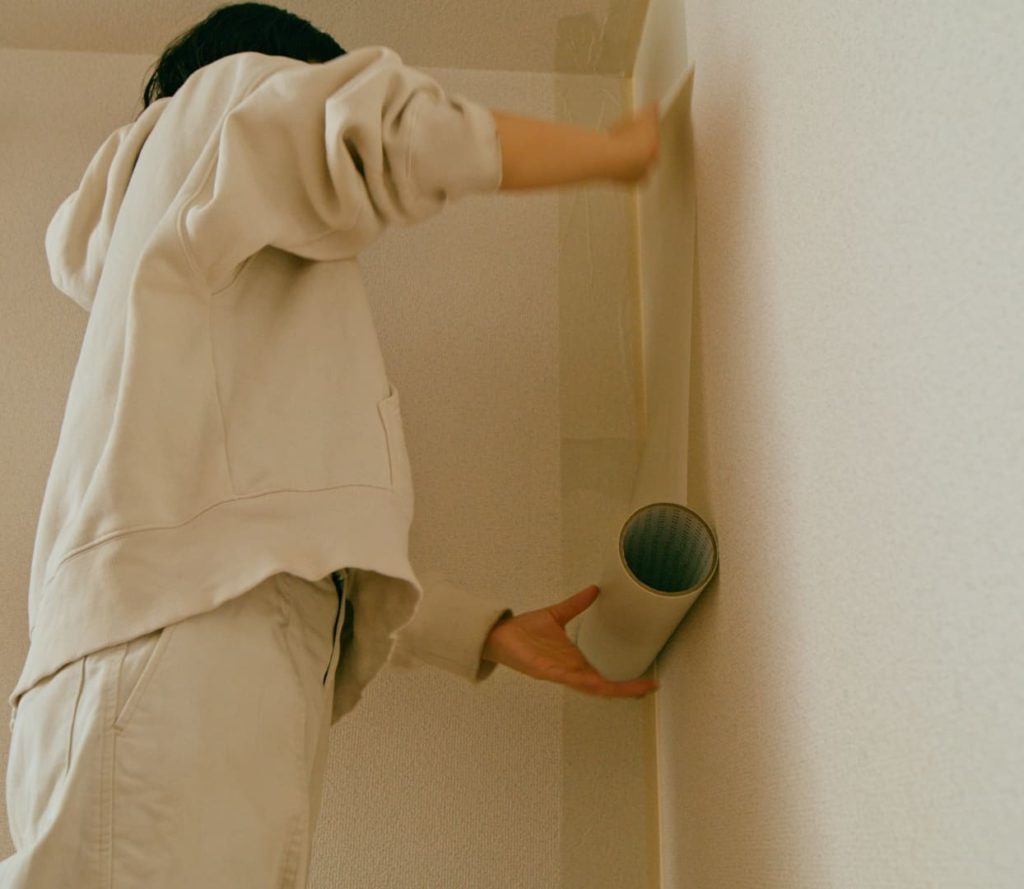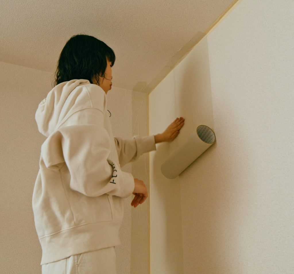 テープの芯(筒)の中に手を入れ、壁に沿って下に滑らせるように動かすと、力が均等にかかってシワになりづらく綺麗に貼れます。多少のシワは、ひとりで塗れるもんの質感で隠れるので、神経質になりすぎなくても大丈夫です。
