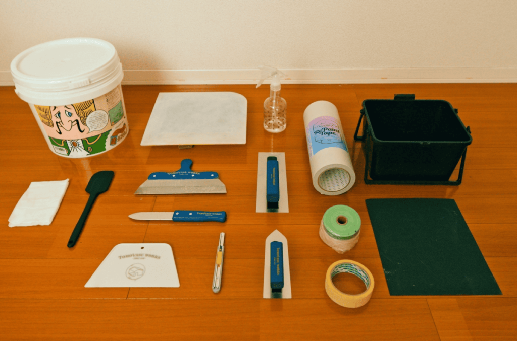 - 施工道具一式(パテ板、コテ、角ベラ、地ベラ、カッター、スムーサー、タオル)