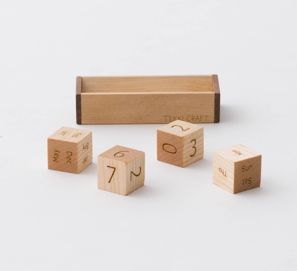 そんなことを考えているときに、友安製作所から発売されたのが「ミニキューブカレンダー saicoro」。その名の通り、サイコロみたいな可愛らしい見た目に一目惚れ。4種類のキューブと天然木のホルダーからなるキューブ型のカレンダーです。