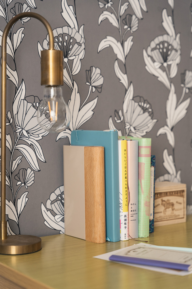 こちらの壁紙は、以前CyanがDIYで貼ったもの。賃貸OKの壁紙のりを使っているので、原状回復も簡単です。柄物ですが、落ち着いたシックなグレーが、派手過ぎず大人っぽいイメージ。