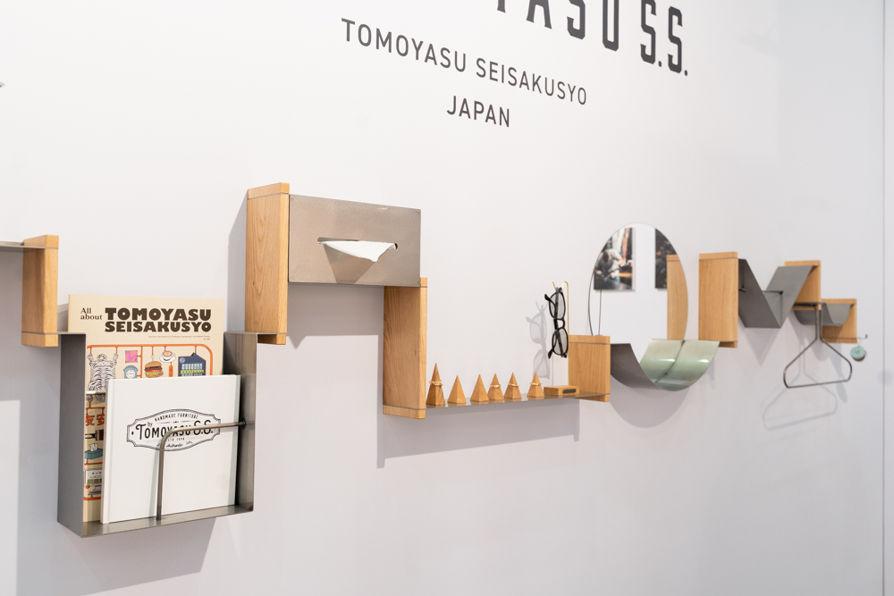 色とりどりで華やかなブースが軒を連ねる中、友安製作所の展示スペースはあえてシンプルを極めました。真っ白な壁と什器で構成した空間。そこに並べたのは、鉄の素地がそのまま見える「クリア塗装」の商品たちです。通常、by TOMOYASU S.S.の商品は8色のカラー展開がありますが、今回はあえて「色」で飾ることをしませんでした。それは、職人の高い溶接技術と、妥協のない美しいフォルムを見てほしかったから。 鉄と木、素材そのものの美しさが際立つ空間は、来場者の目を引き、「限りなくミニマルだけど、手仕事の温かみが宿っている」と高い評価をいただきました。