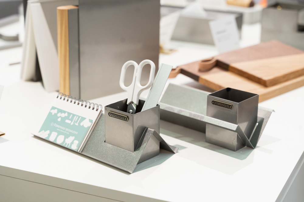 単なるペン立てに留まらない、鉄の素材を活かしたアイデアが来場者の注目を集めました。本体の鉄板部分を「山型」にするか「谷型」にするかで、2通りの使い方が楽しめます。山型にすると、メモやポストカードを立てかけ、視覚的に楽しむ「飾る」スタイルに。谷型にすると、ペンや定規などの文房具をまとめ、デスクを整える「収納」スタイルになります。