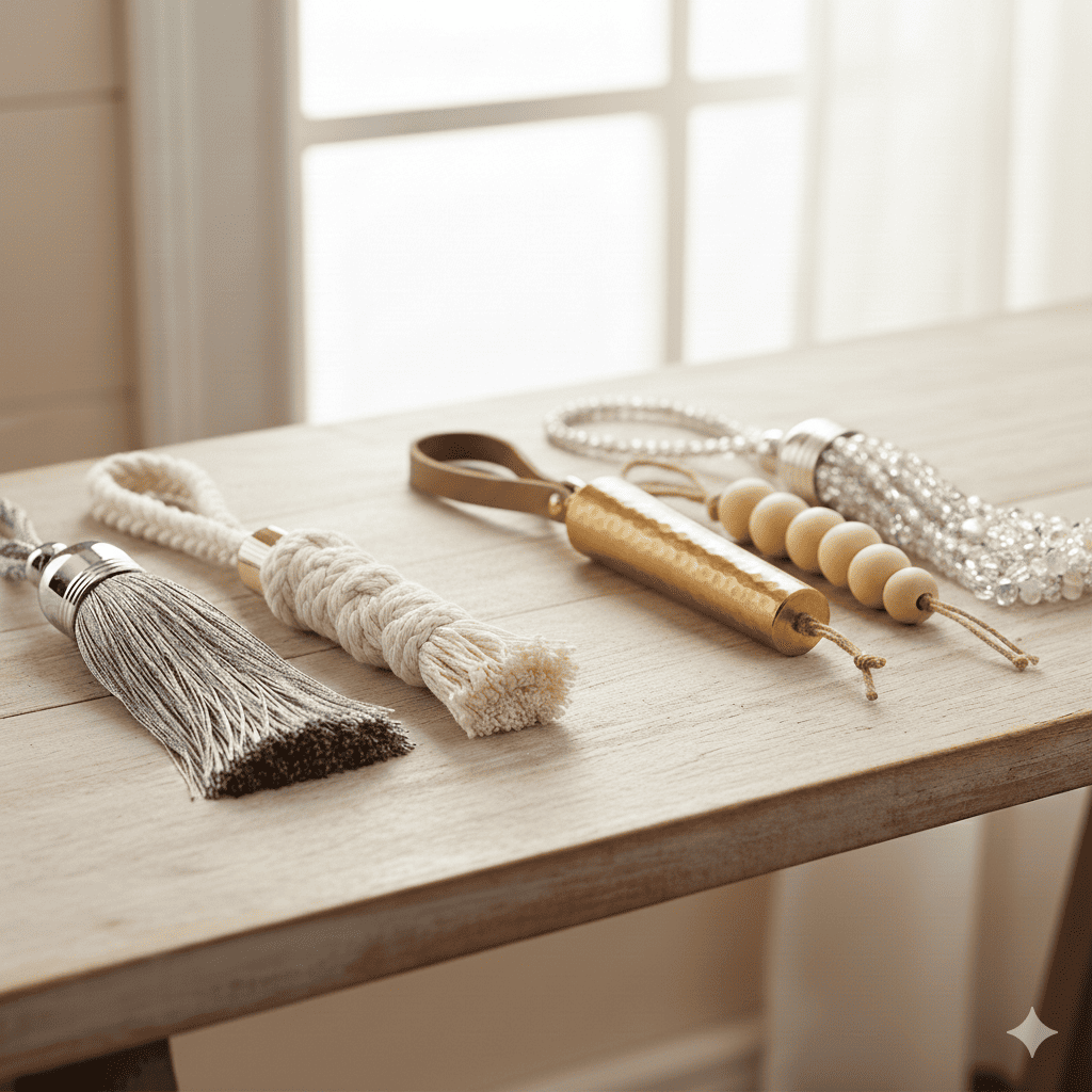 アイアンや真鍮などは、ジュエリーのような存在感が魅力。布製タッセルにはない重厚感で、空間を引き締めてくれます。