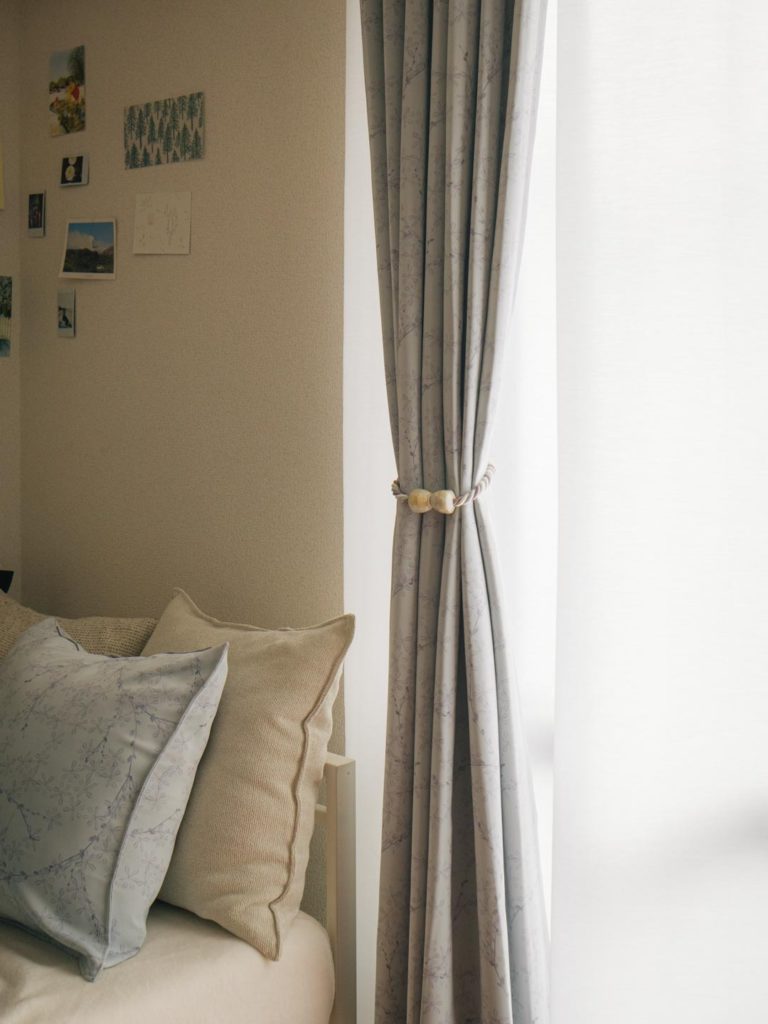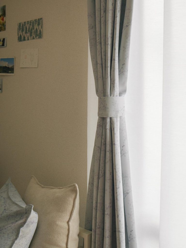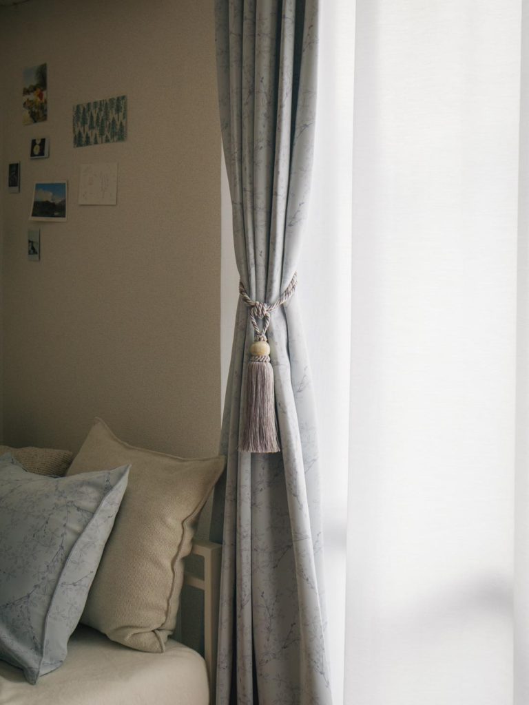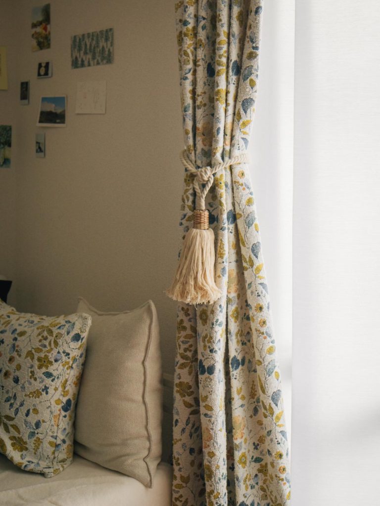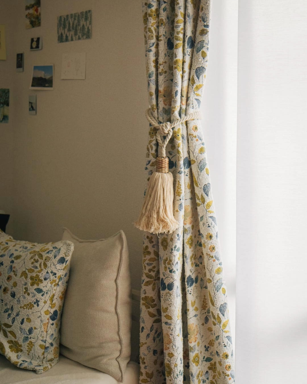 控えめな柄のカーテンには、色味を合わせたタッセルを選ぶと失敗しにくいです。素材で変化をつけるのがポイントですね。