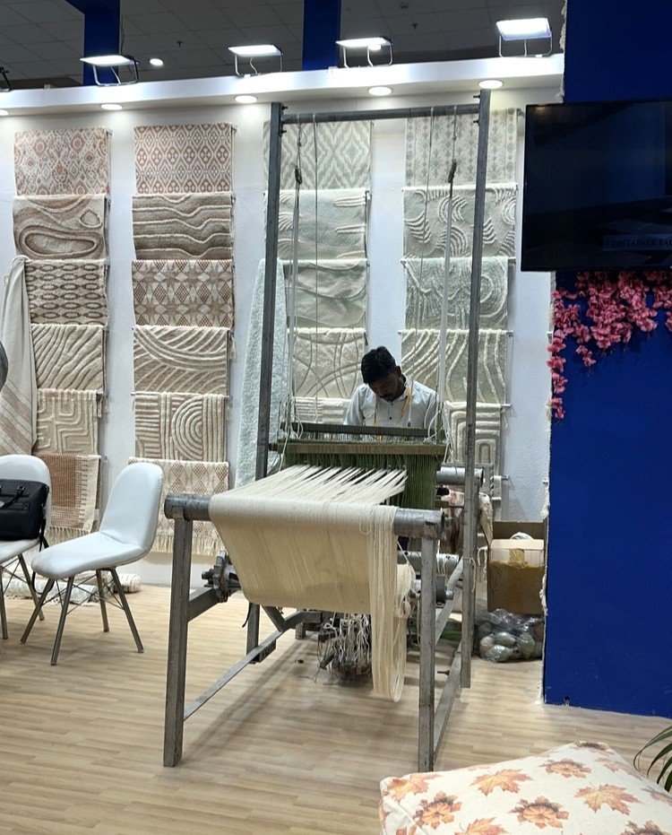 また、今回は世界のトレンドでもある「体験」を重視する展示も見かけました。下の写真は、ブース内で実際に職人がテキスタイルを織って見せる実演展示。インドの伝統的な手仕事の魅力も伝わりやすく、機械での大量生産からトレンドがシフトしていることも感じられました。