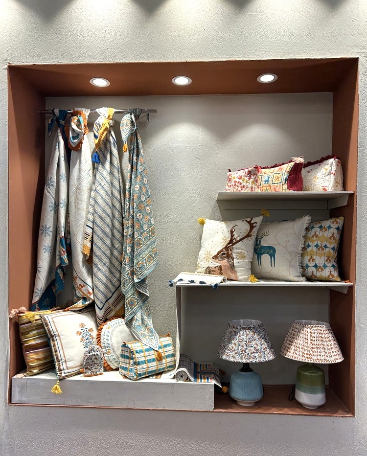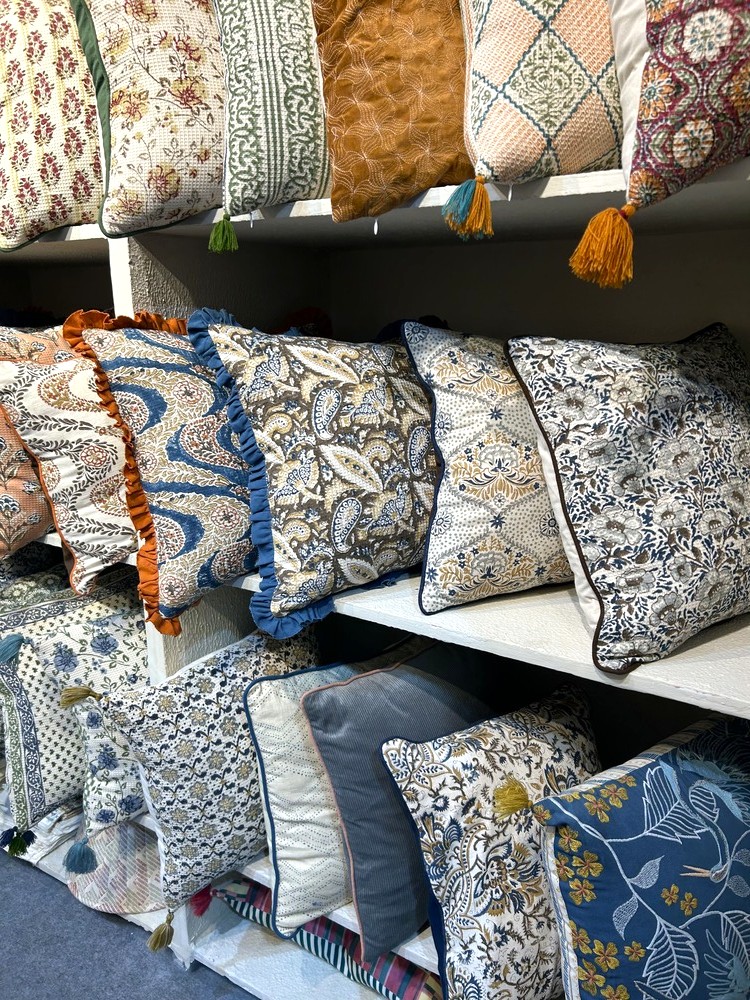 写真のような、インドらしい手仕事感のある、植物柄・幾何学柄・ペイズリーなどのファブリックデザインがたくさん展示されていました。刺繍風の柄、民族調のモチーフ、暖色系のタッセルが特徴的で、まさに“ボーホー”の世界観。