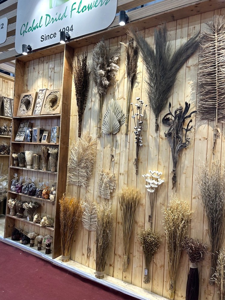 今年のIHGF Delhi Fairでは、昨年ほとんど見かけなかったドライフラワーのアイテムが一気に存在感を高めていました。壁掛けのリースやスワッグ、テーブルに置くだけで絵になる小さなアレンジメントなど、さまざまなブースが自然素材を使った装飾を打ち出していました。
