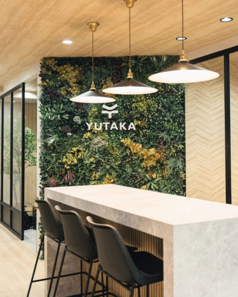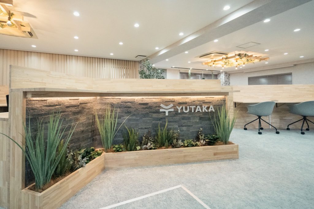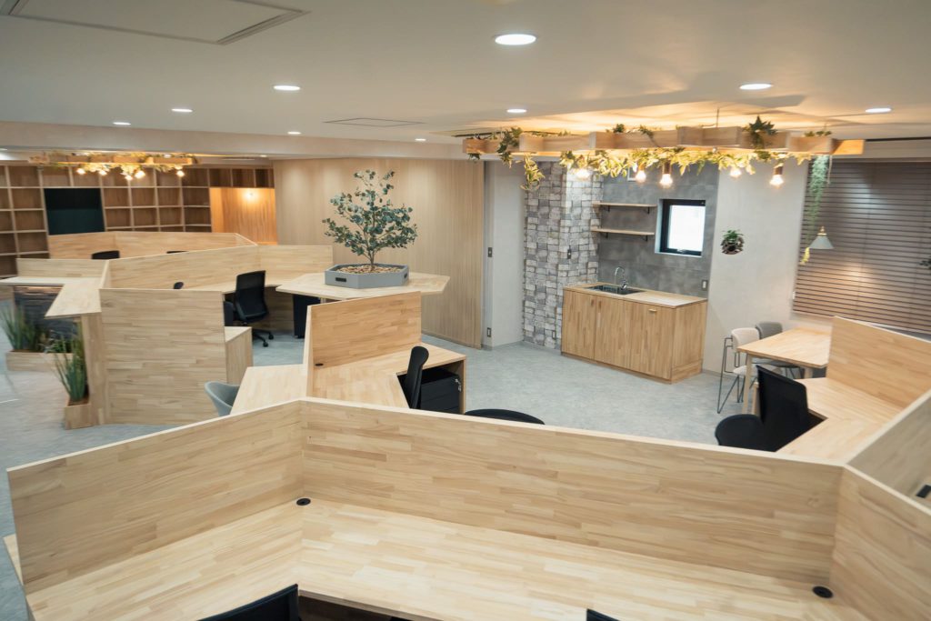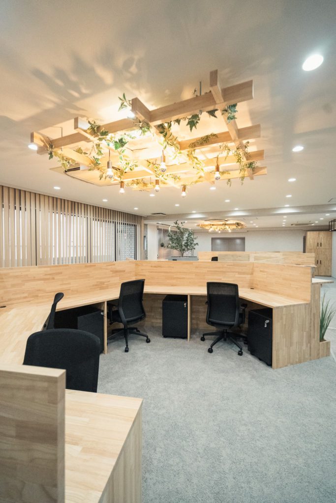 木材とフェイクグリーンを基調としたナチュラルスタイルなオフィスが完成。
