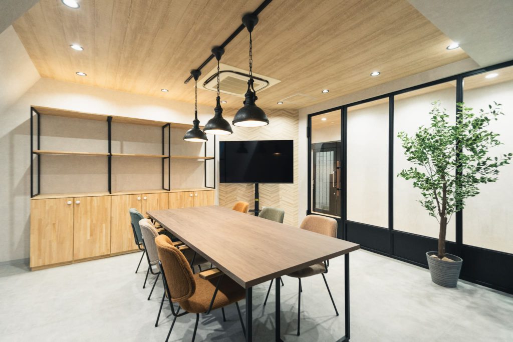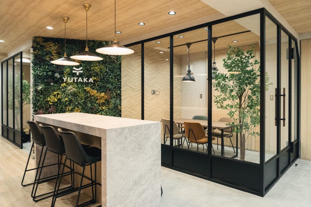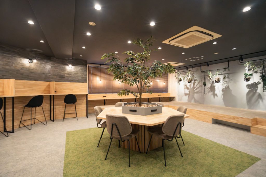 5階の会議室とフリーアドレスの席。目にも優しいフェイクグリーンがいっぱい