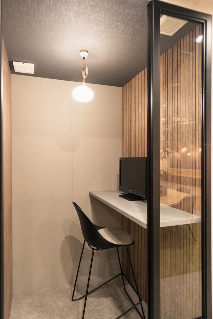 ズバリ「地層」です。土木事業を展開する私たちの「土を掘る」というビジネスと、会社として目指すべき「思考を深掘りする」という姿勢を掛け合わせました。3〜5階の各フロアを、下から上へと地上へ向かうグラデーションに見立てています。まず、一番下の層にあたる3階は、地中に埋まっている状態をイメージした「クローズド」なフロアです。ここは集中と休憩のための場所。作業に集中したいときに使う防音機能がある小部屋や、一人の時間を静かに楽しめる休憩スペースを設けました。