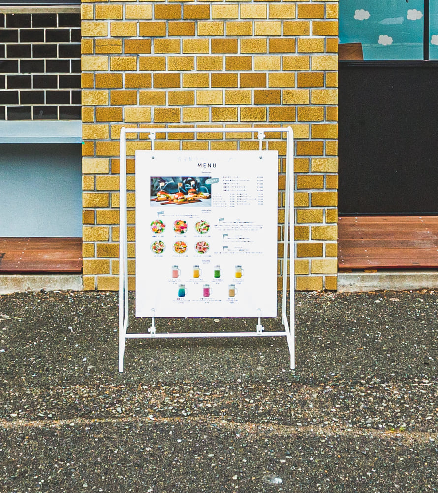 スタンド型・tateは、置くだけで使える手軽さが最大の魅力。目線の高さにメニューや写真を掲示できるので、初めてのお客さまにも“どんなお店か”が直感的に伝わります。季節キャンペーンや価格の変更など、内容を柔軟に変えられるのもポイント。