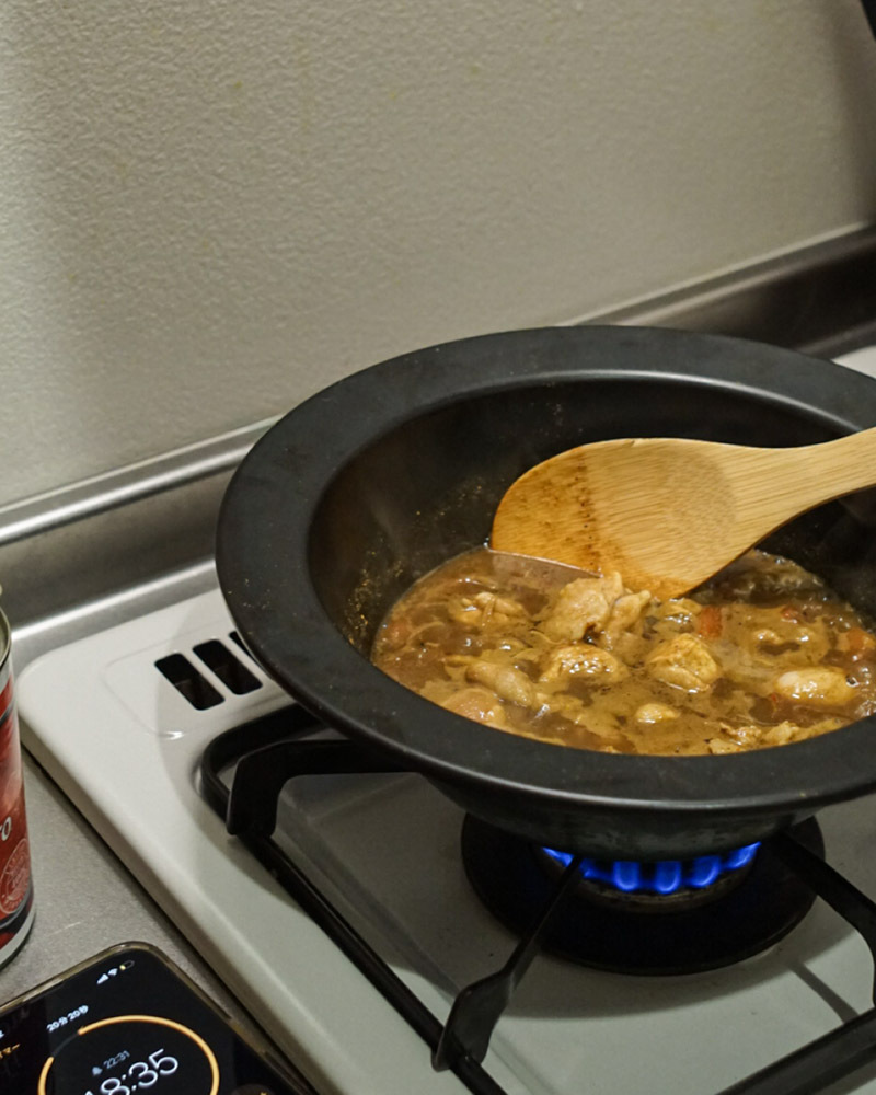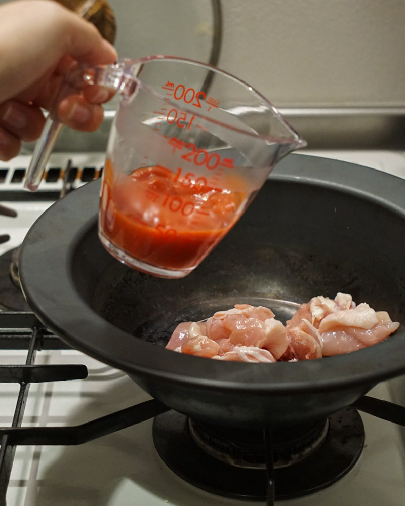 1. スパイスキット、トマト缶、鶏もも肉を鍋に入れ、かき混ぜながら約5分、強火で加熱します。