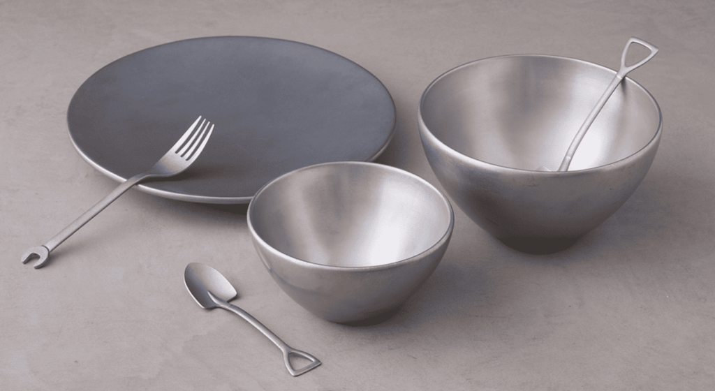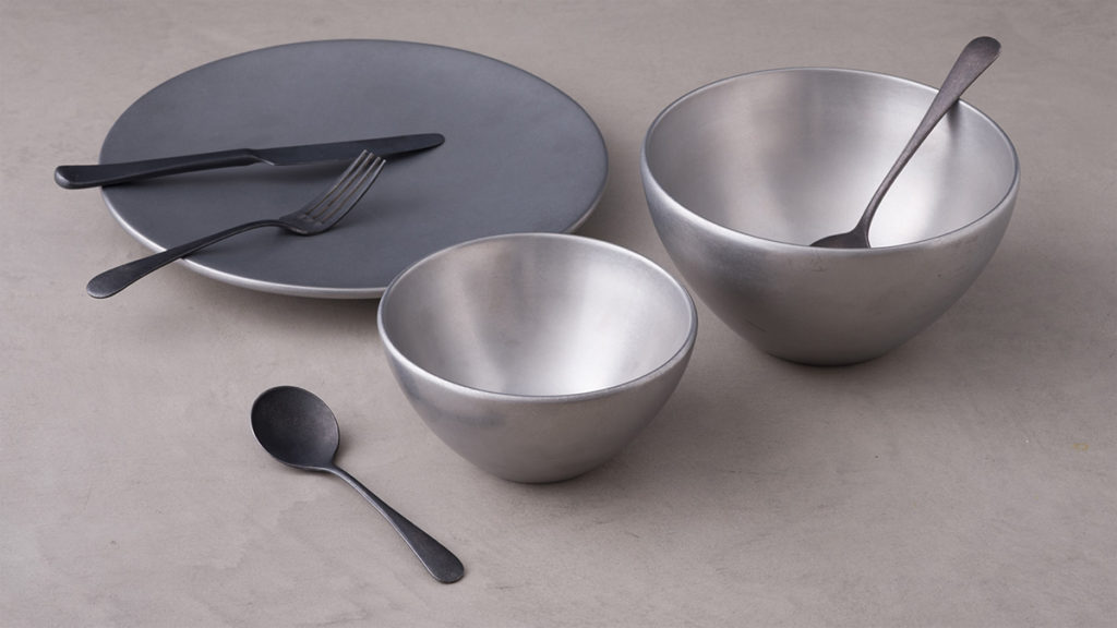 友安製作所で取り扱うVintage Diningの商品は5種類。ステンレス製の表面には、ジーンズにも使われるストーンウォッシュ加工を施し、使い込まれたようなやわらかい風合いを表現しています。お皿は一般的なプレートに見られるフチがなく、シンプルで美しいデザインです。