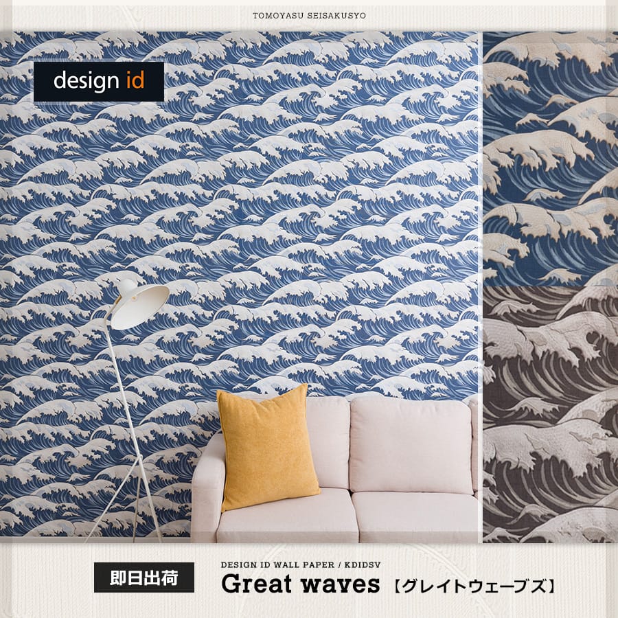 design idの壁紙も、もちろんアクセントウォールとしておすすめのアイテム。しかしそれだけでなく、ふすまやドア、家電のリメイクにも使えるのがポイントです。下の写真のように、グレートウェイブスは和室のふすまリメイクにもぴったり。
