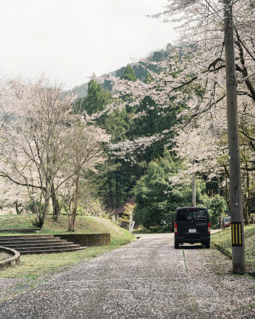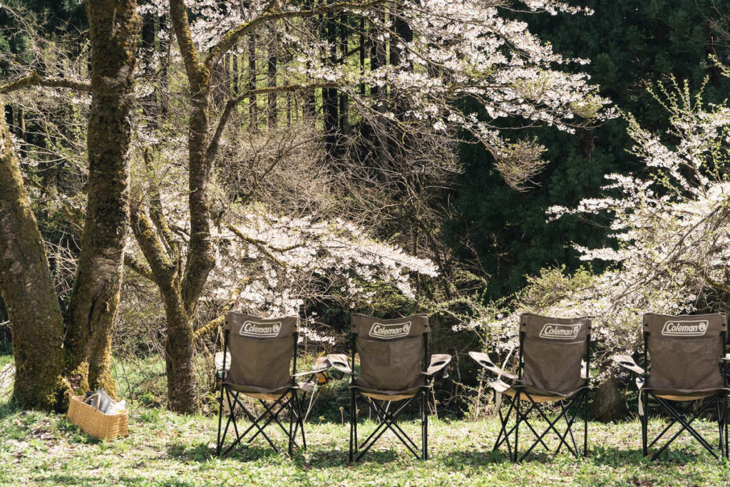 大阪の本社オフィスから約220km離れたところにある、福井県勝山市のキャンプ場・「友安製作所モリノネカワノネIWAYA」。勝山の中心部から少し離れた岩屋の森まで車を走らせると、窓を抜ける風に、やわらかな自然の心地よさが感じられます。そして春には、キャンプ場の風景を一層彩る桜が広がっています。キャンプ場が淡いピンク色の帯に染まる姿は、この時期だけしか見られない贅沢な空間です。