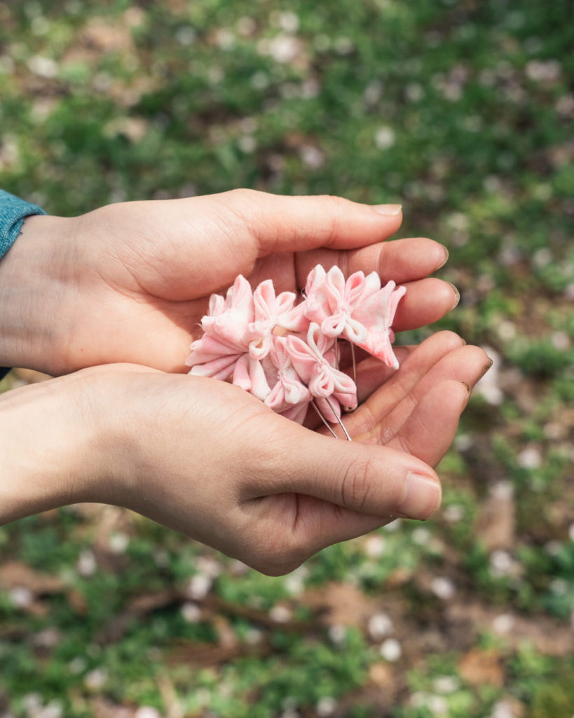 桜まつりに訪れた来場者さんから、私たちに手づくりの桜ブローチのプレゼントが! 着物の裏地を使って仕立てられたという、とても愛らしいブローチをいただきました。イベントの雰囲気にぴったりで、嬉しさのあまり、みんなでさっそく制服の胸元に。温かなお心遣いを通じて、改めてものづくりがつなぐ縁の素晴らしさを感じることができました。