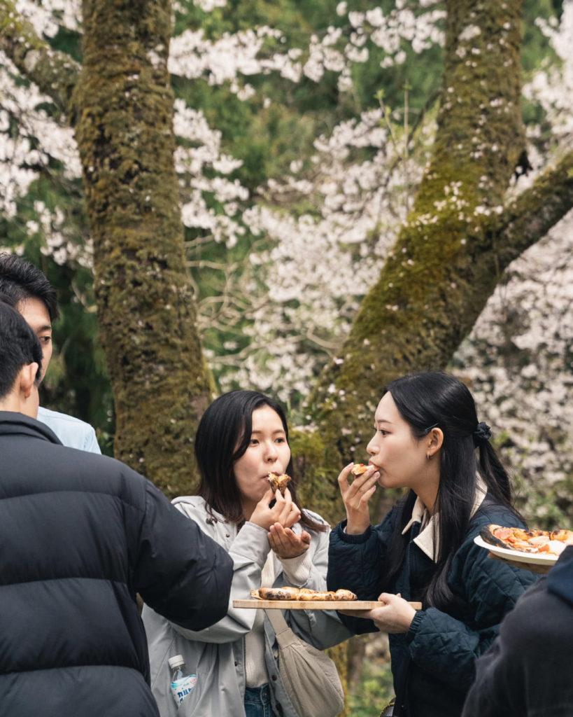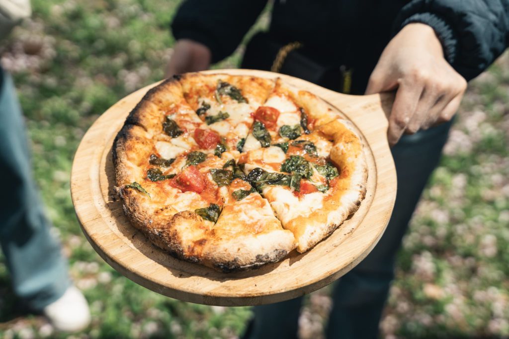 準備ができたら、木炭で温めた薪窯にいざ投入。様子を見ながらこんがりと焼き上げ、カリッとモチッとした食感に仕上がりました。出来立てのピザを手に、薪窯と桜を背景に写真を撮る人もたくさん。特別な外ごはんの思い出ができた様子に、私たちも嬉しい気持ちでいっぱいです。