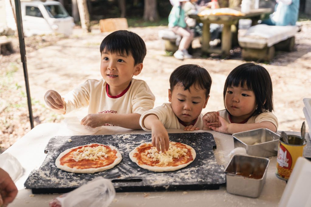 まずは生地の伸ばし方をプロがアドバイス。上から手で押さえたり、持ちながら広げたりと、簡単そうに見えて実はコツがいる作業に、「難しい!」とわちゃわちゃ楽しむ様子が見られました。生地を伸ばした後は、3種類のトッピングセットとオプションの具材から、好きなものをセレクト。特に、ピザの定番「マルゲリータ」が一番の人気でした。