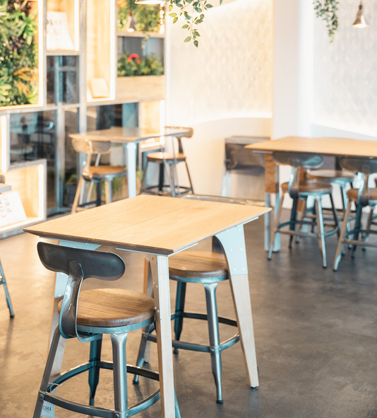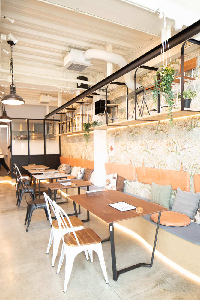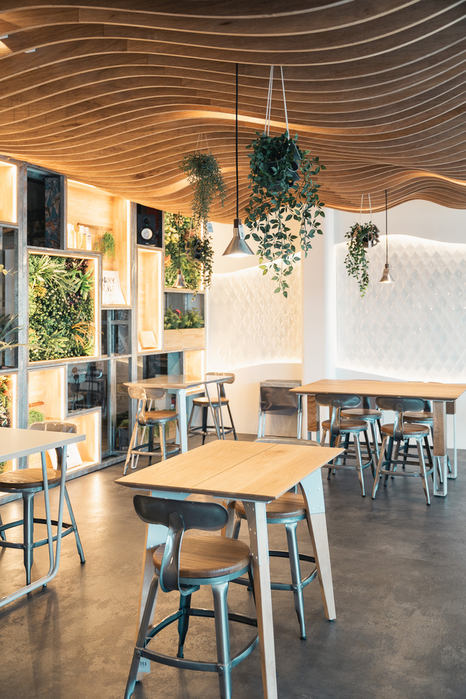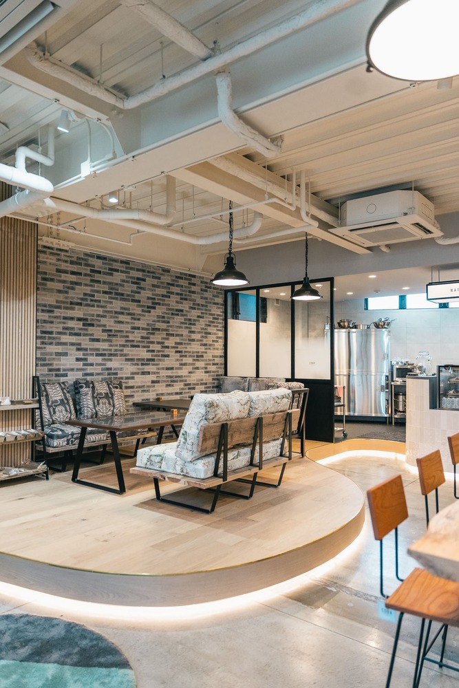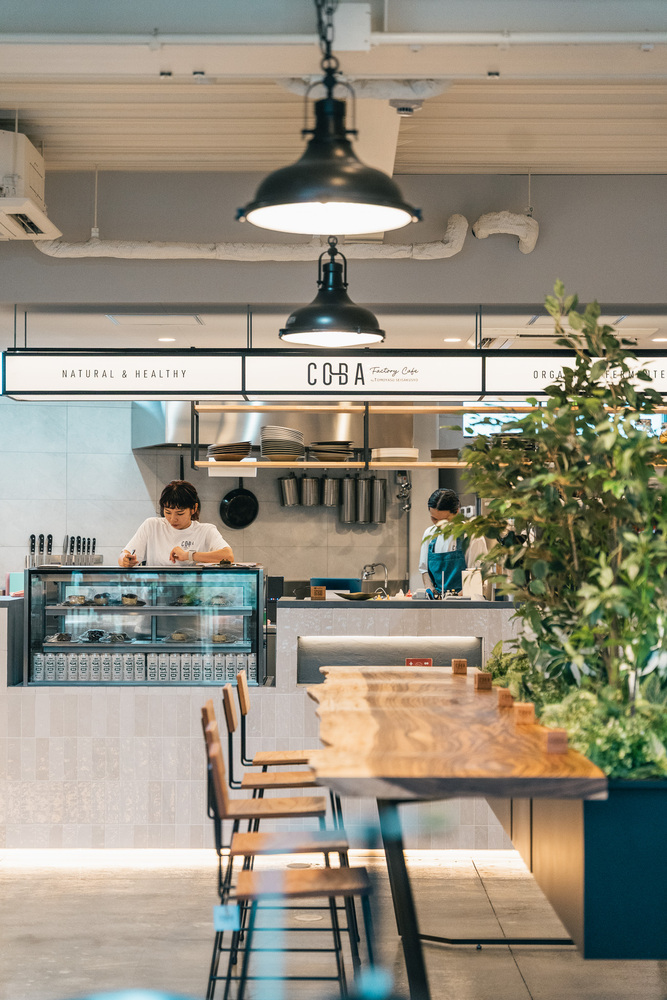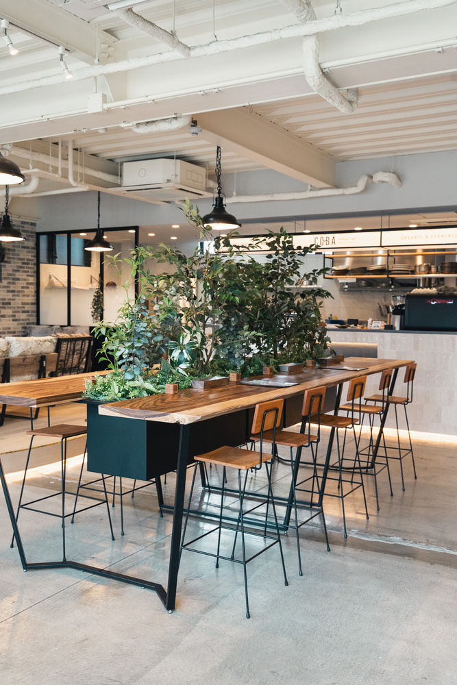 CO-BAの食のコンセプトである「からだに優しい、素材を活かした食事」に合わせて、内装のコンセプトも「自然素材」を活かしたデザインに。