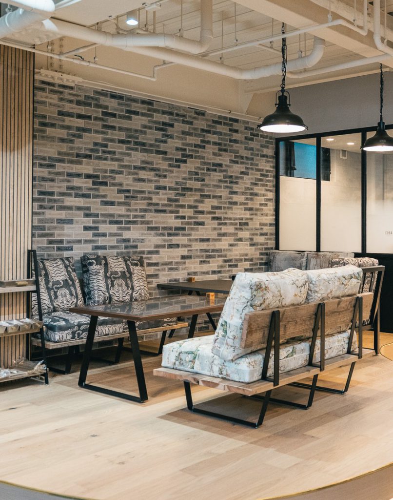 例えば、テーブルに使っているさまざまな木材や、ベンチの本革クッション、壁面の壁材も本物の石をスライスしたもの(デコストーン・レトロブリック)や天然の木材を使ったもの(ウッドパネル・ハッティーヴィンテージ※販売未定)を採用しました。