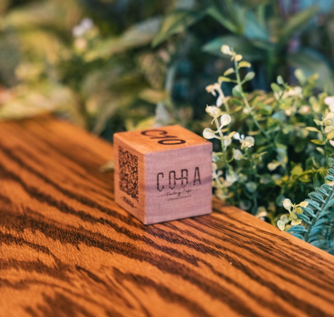 味気ないアクリルのQRコードスタンドではなく、温かみのある木を使ってあそび心のあるキューブ型にしました。