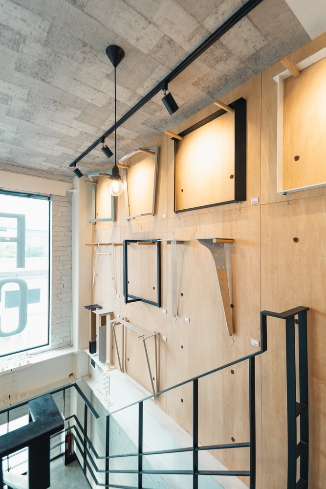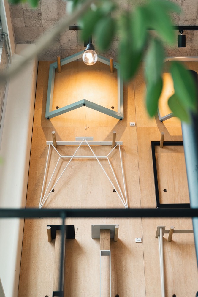 完成した内装デザインは、何度も修正を重ね、最初に提案したデザインから大幅に変更されているそうですが、その中で最後までStoreの提案が通った場所があるそうです。それは、階段横の壁に広がるテーブル脚の展示スペース(上の写真)。