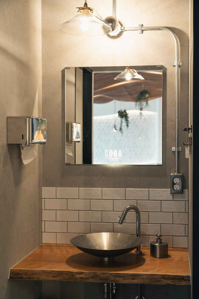 洗面台の鏡にある「CO-BA」のロゴは、鏡の裏をわざと傷つけ、光を透過させることで、まるで浮き出ているような見た目を実現。周囲の壁は、左官仕上げのように見えますが、水にも強い壁紙を採用しています。