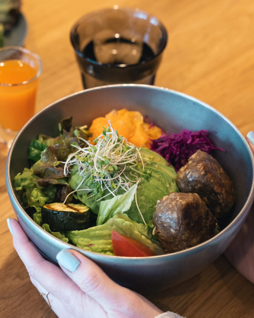 20年以上にわたり、ヴィーガンライフを実践しているコーディネーター・Sara。そんな彼女の舌を唸らせたのが、「彩りヴィーガンブッダボウル」です。野菜や穀物、ナッツなどをバランスよく盛り付けたブッダボウルを、CO-BA流にアレンジ。ケールやキャロットラペ、紫キャベツのアチャールなどの彩り豊かな野菜に加え、大豆ミートでつくられた特製ミートボールが主役を飾ります。動物性食材不使用とは思えないような食べ応えを実現しました。