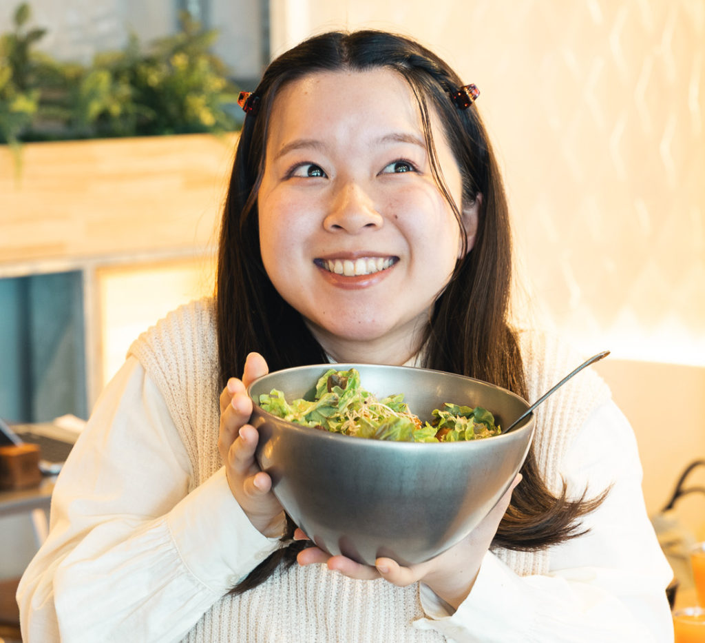 私のメインの定番は大豆ミートボール。頭も体も使うので、疲労回復に効果があるビタミンやミネラルと、筋肉を支えるタンパク質の両方を摂っておきたいんです。CO-BAのサラダプレートなら、「これでもか!」っていうくらい野菜をしっかり食べられるし、植物性タンパク質をきちんと摂取できる。お腹もかなり満たされるので、これで次の格闘技の試合も打ち勝てる気がします!