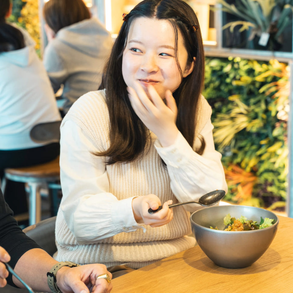 新卒3年目、普段は一人暮らしというグラフィックデザイナー・Lambがこの日に選んだのは「彩り海鮮ポキボウル」です。ハワイのローカルフードとして親しまれている「ポキ」は、日本では丼にして食べるスタイルが定番の人気グルメ。さらにCO-BAでは、朝イチに仕入れるサーモンなどの鮮魚と、アボカドやレタスなどの彩り豊かな有機野菜、そして仕上げに香ばしい風味の有機ごまを合わせたナチュラルな一皿になっています。また有機野菜には、発酵食品の味噌と豆乳を使用したオリジナルソースをプラス。素材の味を引き立て、最後の一口まで飽きさせない味わいに仕上がっています。