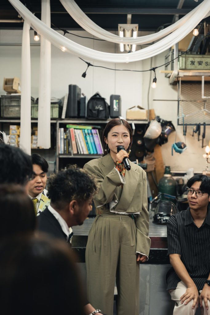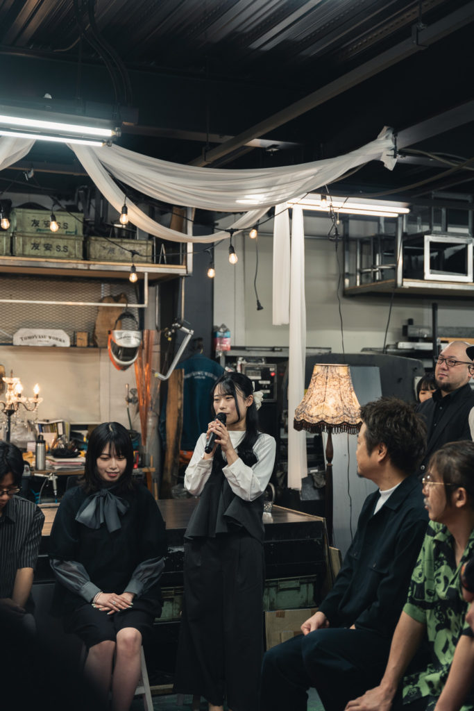 友安製作所の一員としての決意や、仕事への覚悟を口にする5名。マイクを両手で握り締め、初々しく話す姿が微笑ましく、会場には自然と笑顔が広がります。「早く一緒に仕事をしたい」というワクワクした気持ちが、先輩たちの間でも膨らんでいきました。