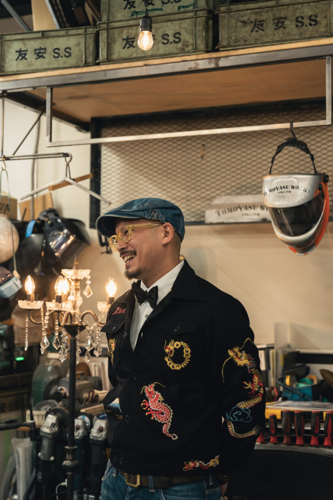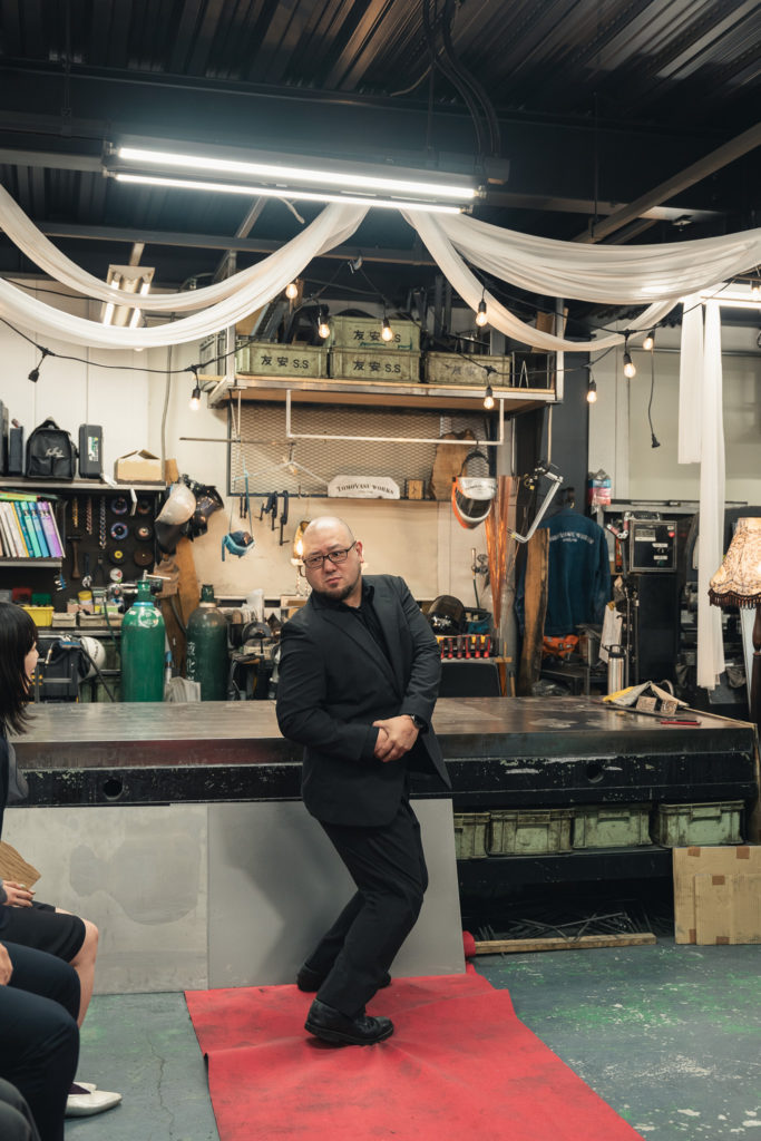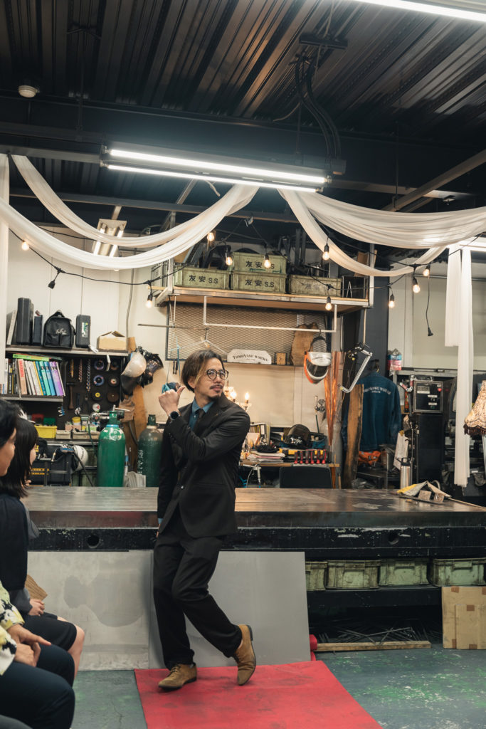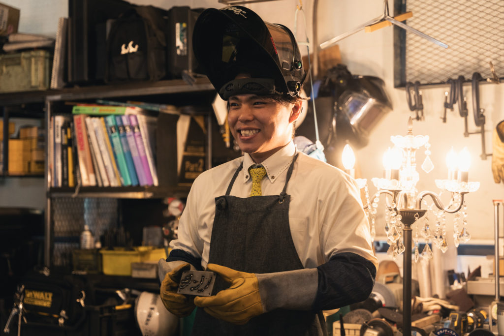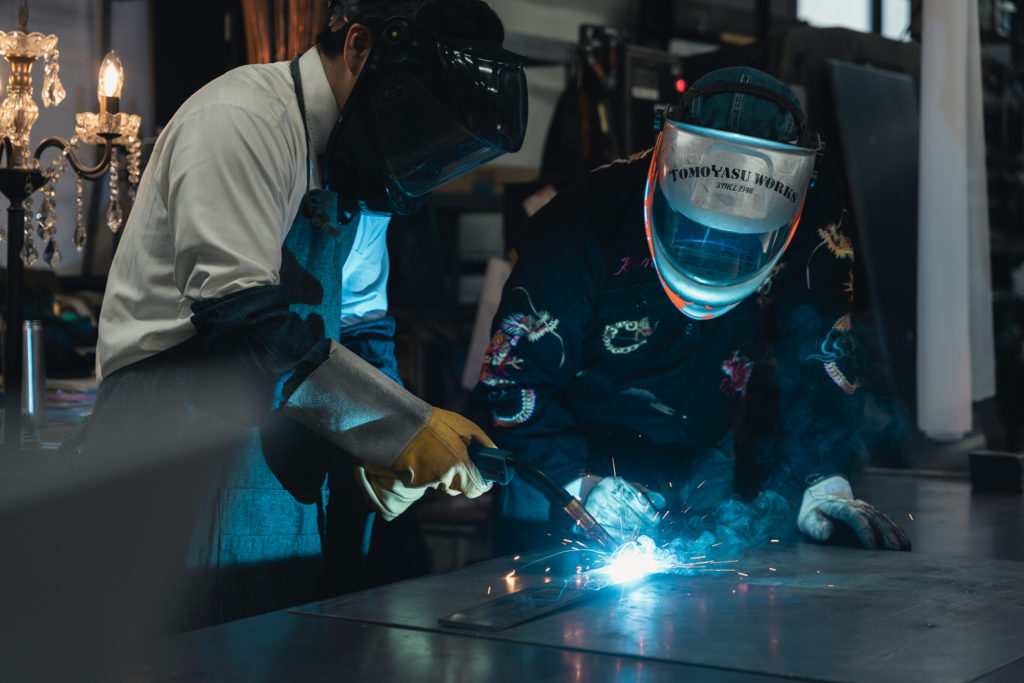 鉄工職人のPunchとPeterからレクチャーを受けながら、溶接面を被り、溶接トーチを握ります。パチパチとオレンジ色の火花が舞い、無骨な鉄が何かに生まれ変わっていくという特別な体験をした5名は、もうこれで友安製作所の一員です。真剣に溶接に取り組んでいた彼らの姿を、先輩社員は写真や動画を撮りながら温かく見守りました。