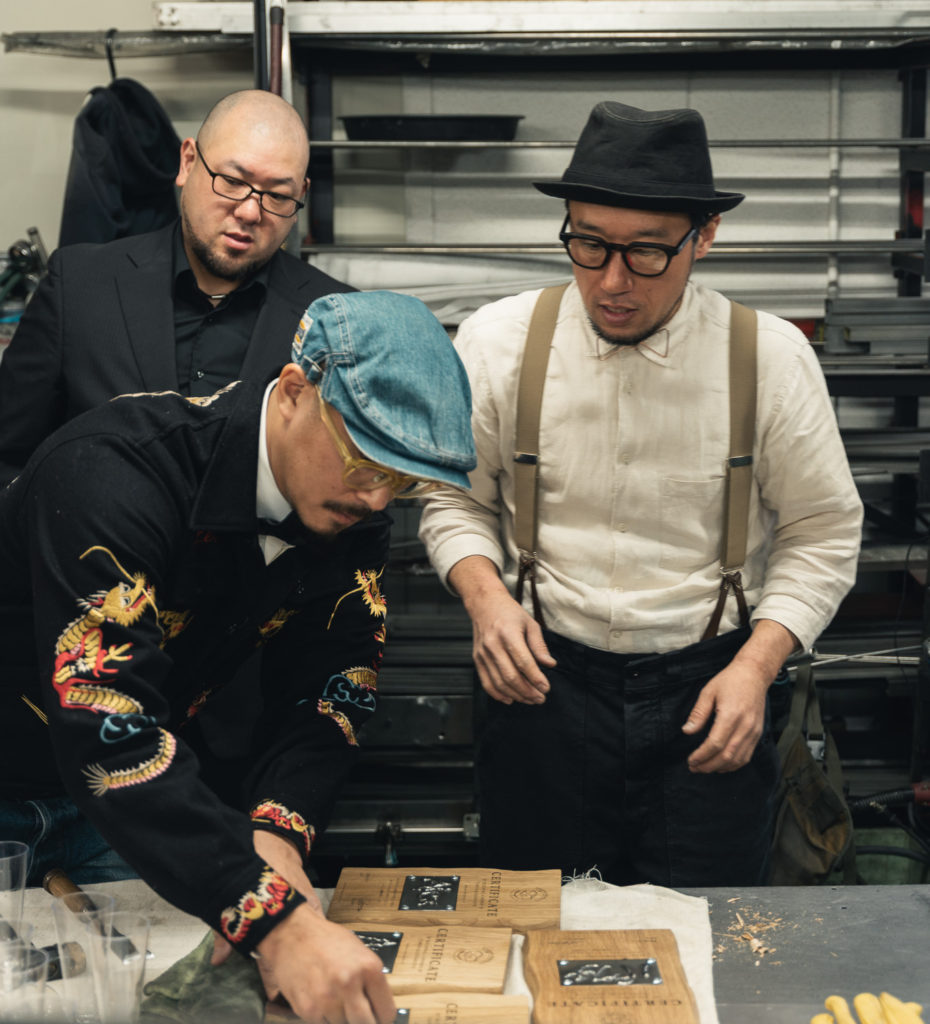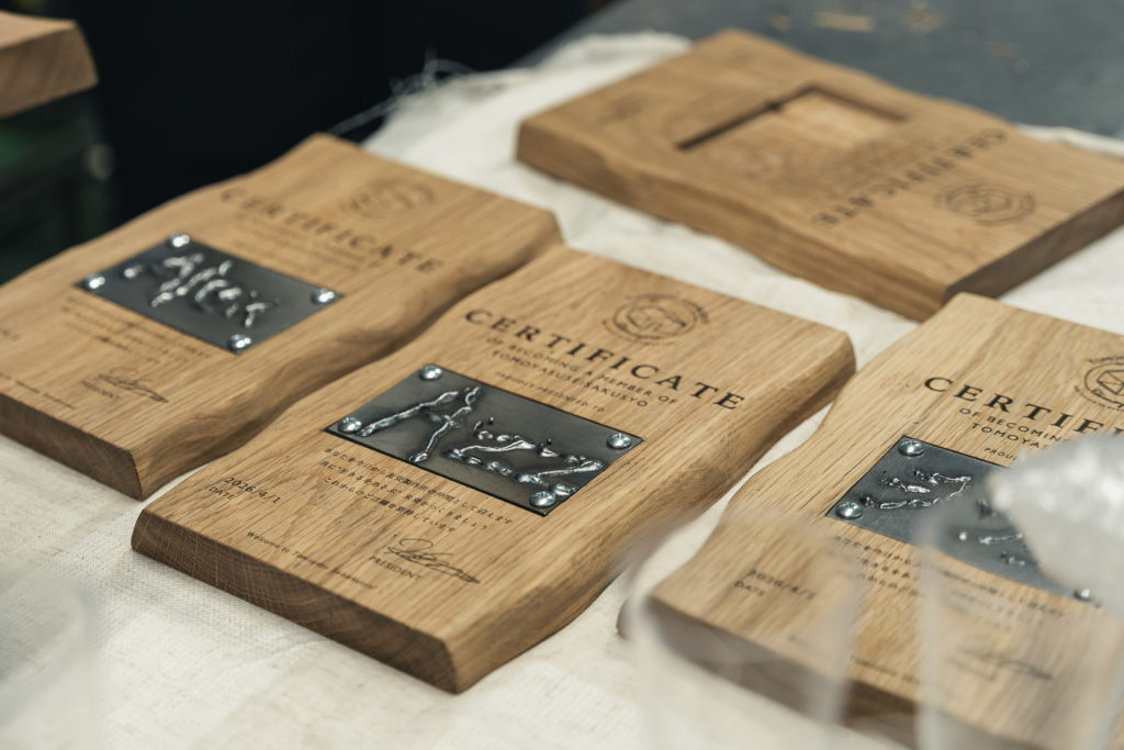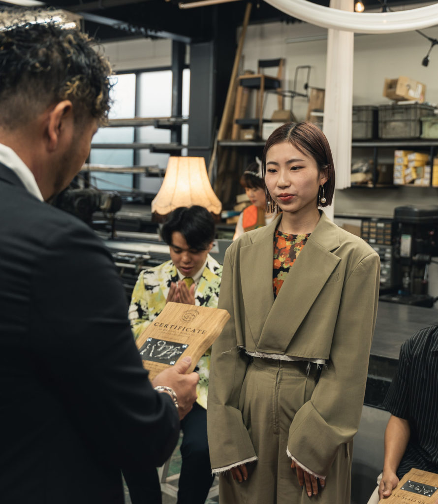 なんと、木工職人が一枚一枚削り、レーザー刻印を施したオリジナルのボードに、先ほど溶接した鉄プレートをはめ込んだ「入社証」が完成。溶接体験で彼らが自分のビジネスネームを刻んだプレートが、立派な入社証へと姿を変えて戻ってきました。自分たちの手仕事が形になった証を手に、新入社員一同、感動の表情に。この世界に一つだけの入社証は、Bossから一人ひとりに授与されました。
