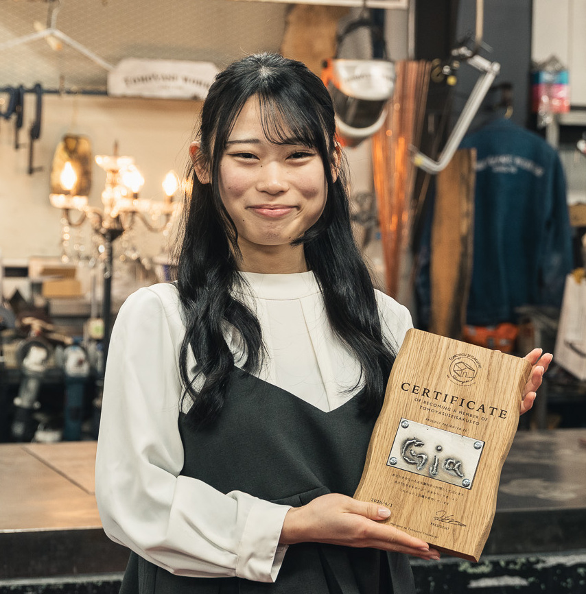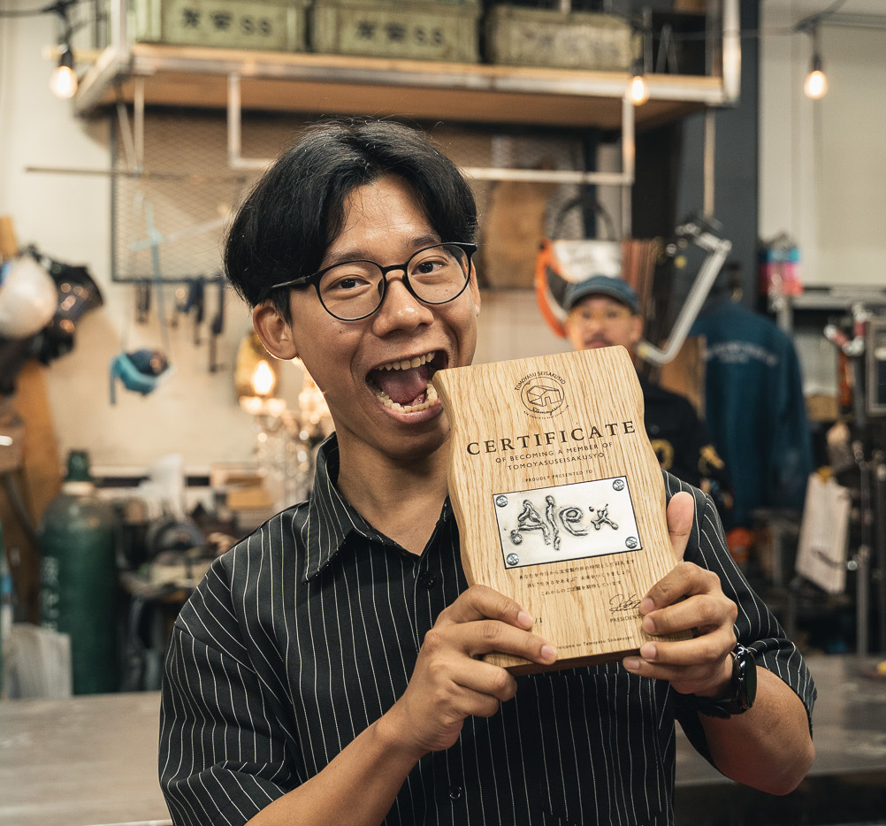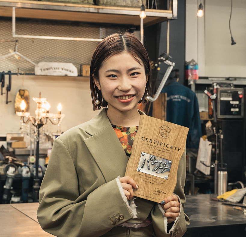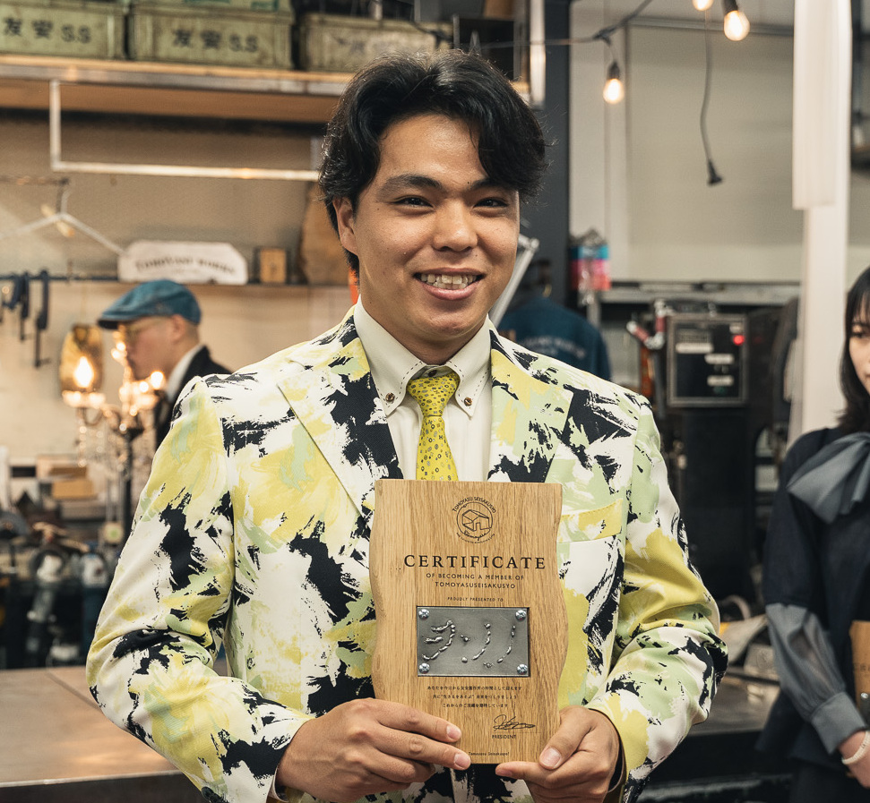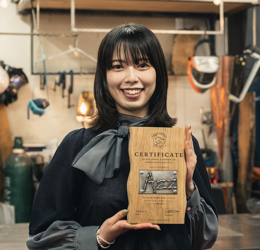 入社証に刻まれた言葉は「CERTIFICATE OF BECOMING A MEMBER OF TOMOYASU SEISAKUSYO」。そこには「あなたを今日から友安製作所の仲間として迎えます。共に“生きるをあそぶ”未来をつくりましょう。これからのご活躍を期待しています」という意味が込められています。