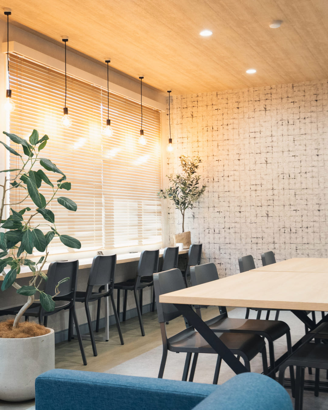 基本的には「お任せで」と伝えました。「素人が変に口出ししないほうがいい」と思わせてくれる安心感もありましたし、こちらが口出しすると、友安製作所さんの良さを消してしまう気がしたので。ただ、50人が座れる広さが欲しいとか、カウンター席があるといいとか、そういった実用面の要望はしっかり伝えました。 また、床は張り替えたばかりだったのでできれば残したい、ブラインドも使えそうならそのままで、といったコスト面の制約もお伝えしましたね。